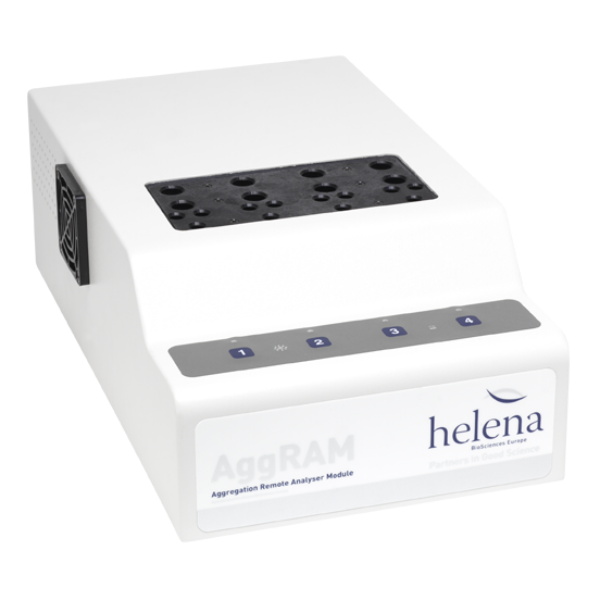 - Helena AggRAM oferuje w pełni konfigurowalne testy agregacji płytek krwi i kofaktora rystocetyny z wykorzystaniem agregometrii transmisji światła na osoczu